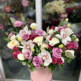 Price: $150.00 Flowers box with pink roses and pink cymbidium orchids. The photo shows a deluxe size. Product Tags: Same-day Delivery