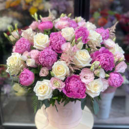 Price: $160.00 Flowers Box with peonies . The photo shows a standard size. Product Tags: Best seller Same-day Delivery